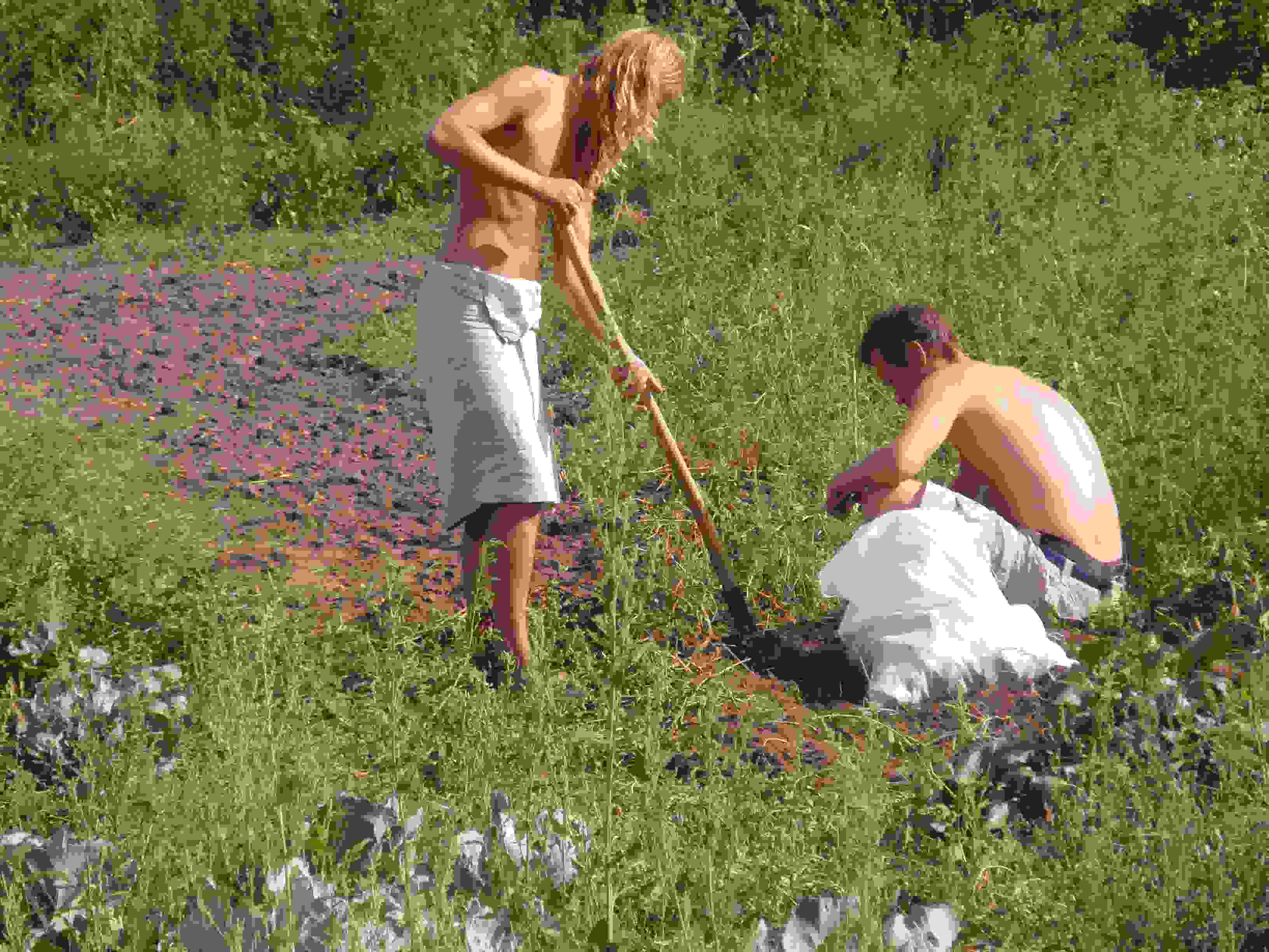 There are many impressions and experiences I now want to share with you, but, alas, there is not space for all. I will thus quite simply (not easy for an anthropologist) tell of how I was introduced to the ‘fairytale’ in Romashki. This event happened soon after I arrived, and was to colour the remainder of my stay. Barefoot and bare chested, Pietro with his 6 year beard and your narrator with his 6 week stubble walked up the tree lined path to the main road by the bus stop, a 15 minute walk. Surrounded by large fields as far as your eyes can see, this is another world than the little hidden village of Romashki with its little plots of land, its pockets of forest, and its canvass of colors. Here, like in the cornfields of Iowa, big combines come and harvest these fields of wheat, the only plant which is allowed to grow. With its sharp cutting blades turning in controlled anger, the screaming mechanical beast of the combine, with its stinking breathe of smoke, rapes the homogenous life beneath it. What is left behind is a monotonous landscape devoid of nutrients and life, with only a few patches of straw left over which the beast had failed to notice. But when we arrived this late afternoon, the beasts had gone, and all was quiet. There was a light drizzle, but warm as Pietro and I came to collect this left-over straw to use as a building material for the house, and as something ‘soft’ to sleep on. We each filled a large bag, and balancing them on our heads, began to walk back home; somewhat alike to an image I have of African woman carrying jars of water on their heads. The drizzle ended, and steam came up from the road. For some reason I felt the desire to stop and turn around. Looking back down the road we had taken, along the horizon, I saw one of the most extraordinary sights of my life: Two complete rainbows! I could not believe my eyes and could not speak a word. I just stared and stared in wonder and amazement. Like two beautiful and vibrant lovers spooning in heavens above, the sight evoked a profound sense of natural harmony and love in my heart. The two rainbows were one. Petro came up and stood silently beside me. Nothing was said for a while. Then he looked at me, smiling, and with a note of contentment said: “we live in a fairytale”. We put the bundles back on our heads and continued walking across the hills back to our little cob house in our little village by the little lake.