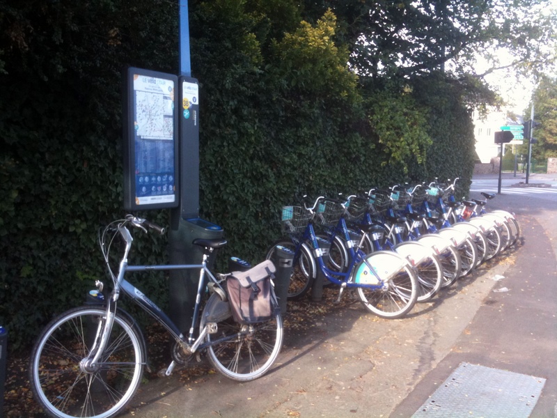 Part of this ‘development strategy’ was ‘the bike’. Indeed, a bike. Because of the many (older as well as new) apartment buildings, cars are not very comfortable in the city. But even a bike can be problematic, because within the corridors of the apartment buildings there is no place to park your bike (or it is forbidden, like for a lot of the 60.000 students), and neither you can park your bike on the pavement: the streets are often too narrow. The solution for this problem was rather simple: the city ‘collectivized’ the bike. For €30 a year, everybody have free access and use of any bike of this project, and on almost every corner you can ‘rent’ (using your code) a bike for free (see picture). Very convenient and very cheap (and no problems with broken chains or flat tires). To promote this system, a very dense network of bike trails is spread out all through the city, with often priority for cyclist. I really enjoy to bike in Rennes (having a heavy but decent Dutch bike with you –mine is a Optare Batavus.. makes it extra comfortable). But my colleagues are very critical on the cities ‘biking’ policy, due to the fact that they don’t put much energy in this system anymore.