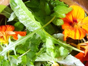 From these examples we started fantasizing on the foods we could make ourselves that would be ‘out of place’ somehow. Some artists and chefs are also busy with this, for example catering based on ‘unwanted animals‘ such as geese that need to be shot because of the ‘nuisance’ they provide for Schiphol, or to cook meals with products of which the expiration date is long gone (Mediamatic initiative). We decided on an extra lunch with foodstuffs or dishes that were somehow a ‘contravention of the order’ playing with the boundary of edibility. The result was a lunch with bread from ingredients beyond the expiration date and with wild flowers in the dough, a salad from weeds (see also this blog on wild food) such as elder, chickweed and dandelion made colourful with nasturtium flowers and garlic grasshoppers and seaweed soup a year past the expiration date. It was a weird experience to carefully pick and select weeds and value each young plant I could find to fill a salad bowl whereas normally I would not think twice and weed them rigorously from the garden!