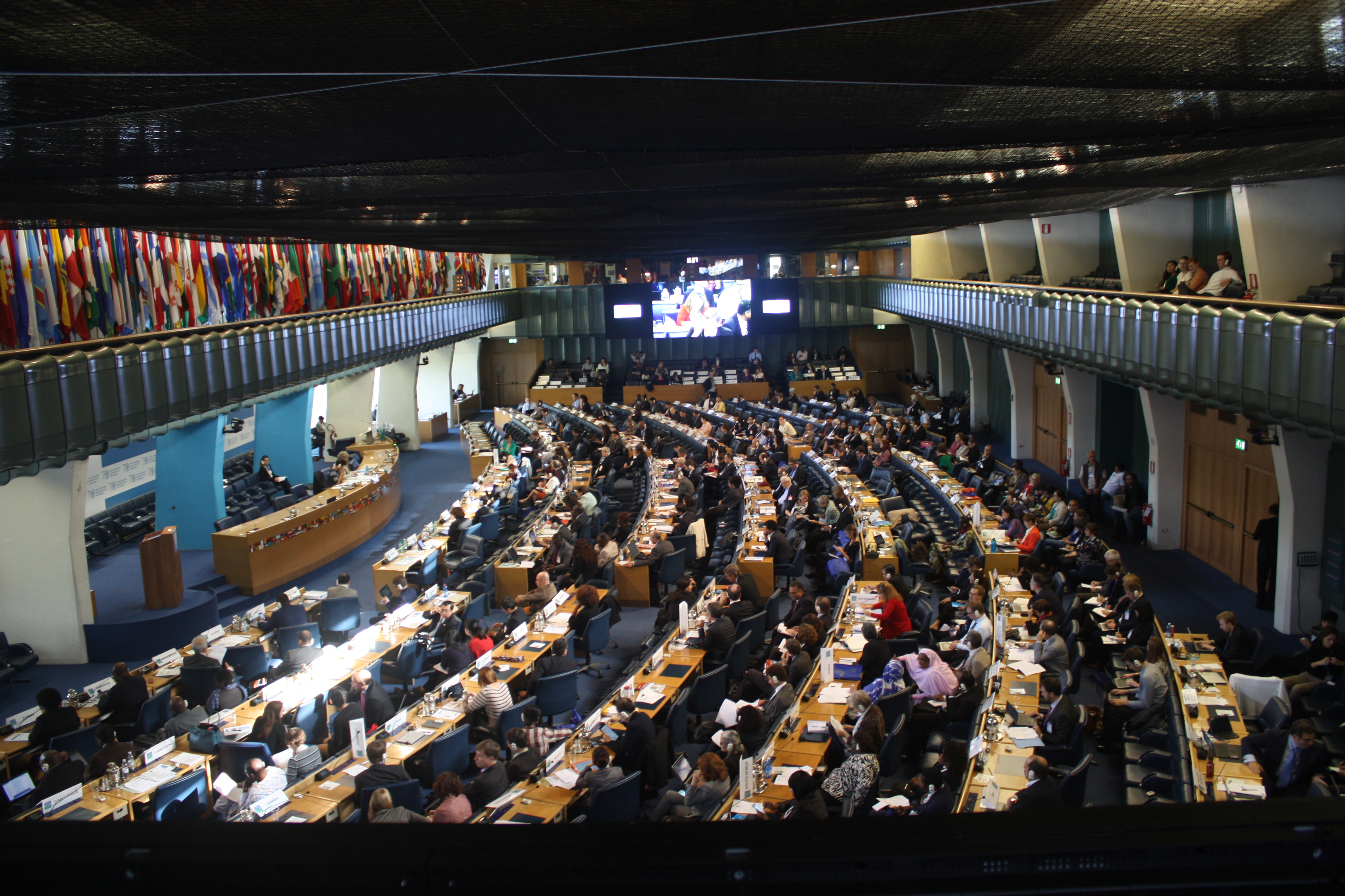 Monday night, 19.00, on the very day we arrived in Rome. We had just listened to several young entrepreneurs ready to use their business plans to improve food security. Right after this “Youth Incubator Event” the opening reception of the CFS took place. Upon entering the imposing glass and white atrium of the FAO we were impressed by all the men and women dressed up in suits. What people see as `business casual´ apparently differs per country. Outfits ranged from proper suits including fashionable high heels to African clothing. At times, this made it easier to guess what kind of stakeholder we were dealing with. Luckily we were prepared for this aspect of the network event, as we had all put on our carefully selected suits and skirts. What we were not prepared for, however, was how to approach all these delegates, keynote speakers, business men and other idols. Delegates rushed by to talk to other delegates, not even taking the time to get a drink or snack. Although their conversations seemed informal, they were most definitely talking business. It was evident that proclaiming statements and negotiation was not limited to the plenaries. This had also been apparent during the side events provided apart from the plenary session during the CFS. Often, people left the discussion only after shaking several hands and exchanging visit cards. When walking through the hallways of FAO’s complex headquarters, people will always check your visitor card to inspect your organization. As students from Wageningen University, we wore green visitor cards showing that we were “Observers”. Many keynote speakers (yellow), participants (blue) or members (red) were not as impressed with our green visitor cards as we were ourselves!