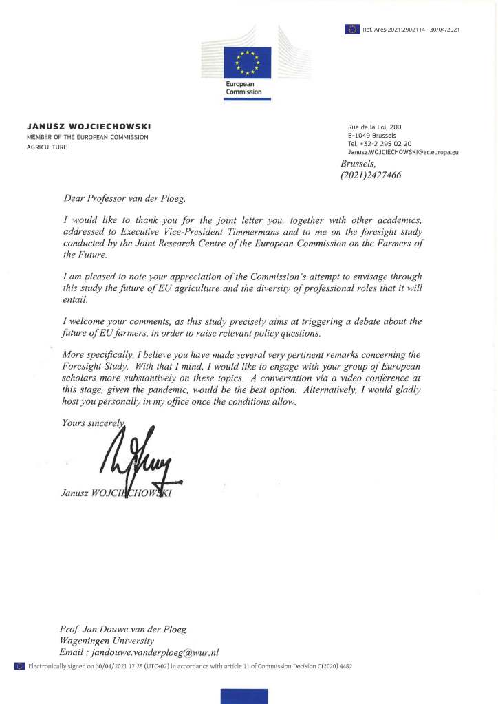 In his response to the letter, European Commissioner for Agriculture Janusz Wojciechowski writes “I welcome your comments, as this study precisely aims at triggering a debate about the future of EU farmers, in order to raise relevant policy questions”.