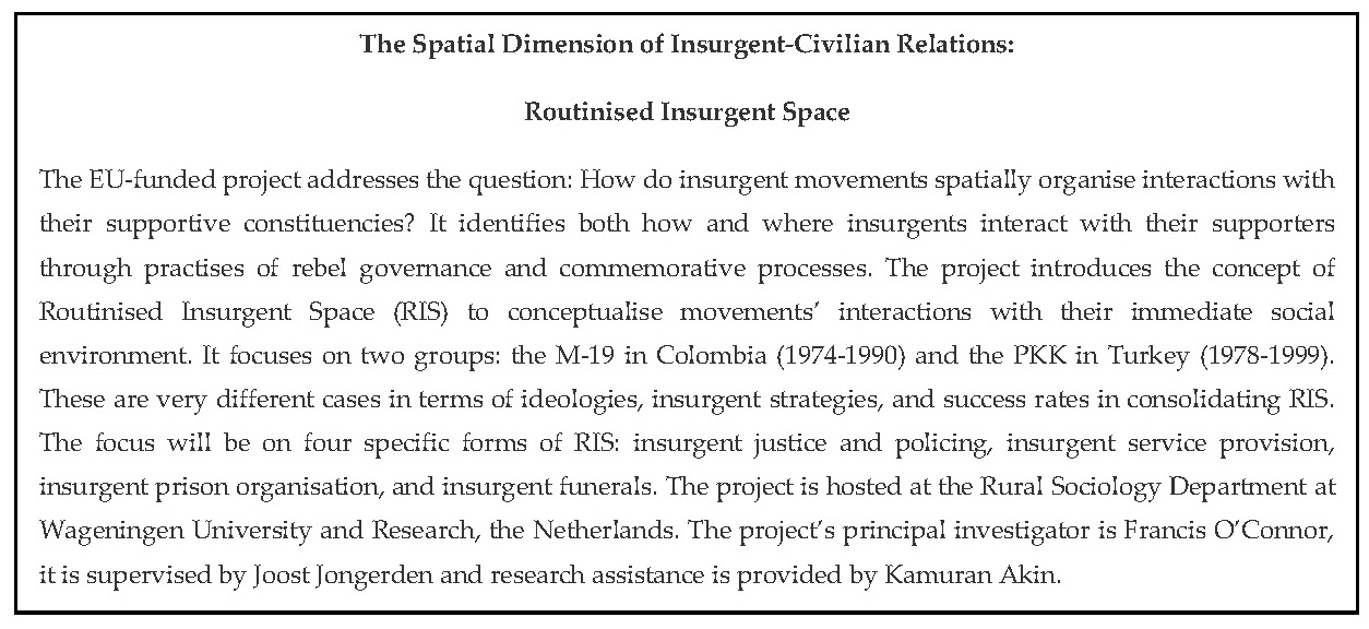 The puzzle of the PKK’s omission of its governance in its publications through the 1980s and 1990s arose as part of a Marie Curie post-doctoral project at the Rural Sociology Department in Wageningen University and Research, titled The Spatial Dimension of Insurgent-Civilian Relations: Routinised Insurgent Space. The project aimed to comparatively track patterns of rebel governance in the case of the M-19 in Colombia and the PKK in Turkey, identifying instances of spatial variation and their chronological evolution. The conceptual premise of the project was based on years of research and fieldwork on the PKK’s relationship with its supporters, which had culminated in a book Understanding Insurgency: Popular Support for the PKK in Turkey (2021) and more recent fieldwork on the M-19 in 2018. The current project was to build on this existing data, supplementing it with systematic analysis of the movements’ own archives, which was conducted by Kamuran Akin for the PKK case in Kurdistan/Turkey and by Francis O’Connor (and previously Jakob Meer) for the M-19 in Colombia.