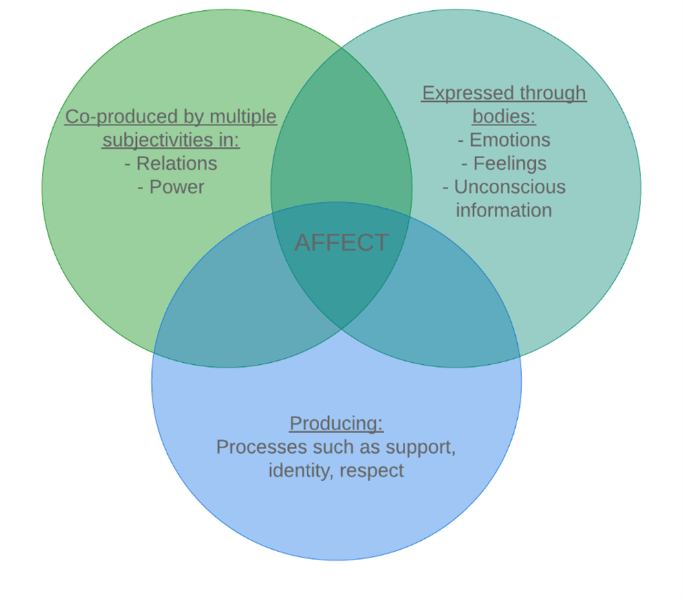 Geïnspireerd door Pile (2009: 16-17) en Nightingale (2011) zie ik het affect als (mede)geproduceerd in relaties en machtsdynamieken, uitgedrukt via emoties, gevoelens en onbewuste informatie en resulterend in affectieve processen. Dit onderzoek richt zich voornamelijk op deze processen, met als doel ze te identificeren en hun invloed op de overdracht aan te geven. Een focus op affectieve processen zorgde ervoor dat relaties tussen boeren, de boerderij, en de omgeving in beeld kwamen en konden worden onderzocht.