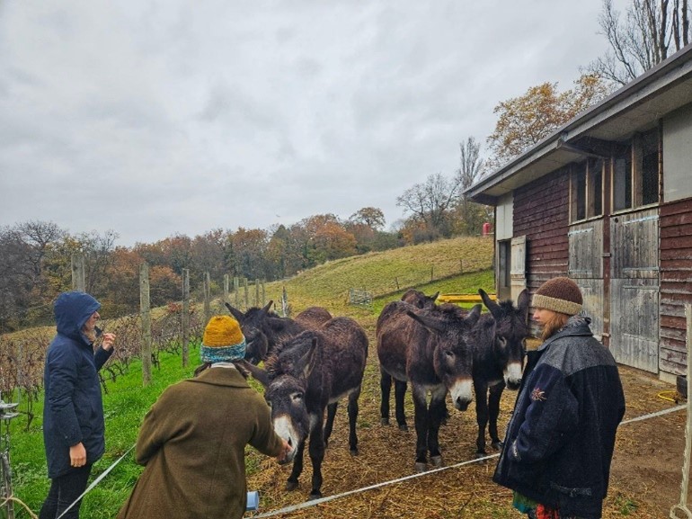 On the fourth day, after three days of being inside discussing, thinking and barely moving our body, the farm visit to La Touvière was a welcome change. La Touviere is part of Uniterre, the Swiss section of La Via Campesina. It covers around 35 ha of land and is fully organically certified. Around 20 farmers are organised in two collectives from which one is fully female-led, with an extensive grazing system with goats and cheese making on the farm. The cheese is sold to organic shops all around Geneva and in their farm shop, which was seldom empty. Their cheese was delicious and so was the fondue lunch to which we were spontaneously invited. It was something special they told us, as a celebration of the first snow of the year. Farm visits are essential to understand the complex realities that farmers navigate in their daily activities, to experience practised alternatives to the industrial agro-industry and to keep believing in a liveable future.