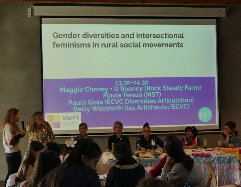 It was expressed how there is an increasing interest in struggles and organising around LGBTQIA+ identities in policy and agricultural spaces. Visibility is gaining ground since the Diversities Articulation from ECVC met for the first time in 2015 and many initiatives are popping up in the US. One panel member reminded us that “LGBT workers have always existed” and have been active within their movement for over 40 years. Strong concerns were raised about how it becomes increasingly more difficult to remain in the space in the current political climate. People expressed both specific struggles within agricultural practices touching upon access to material resources, specifically to land, access to affirming health care, gender-affirming operations, social services and mental health spaces, especially in rural areas, as well as experiences of isolation and discrimination and struggles for recognition and representation in political spaces. Limited data and thus limited recognition and visibility were mentioned and met with the statement “data is political”.