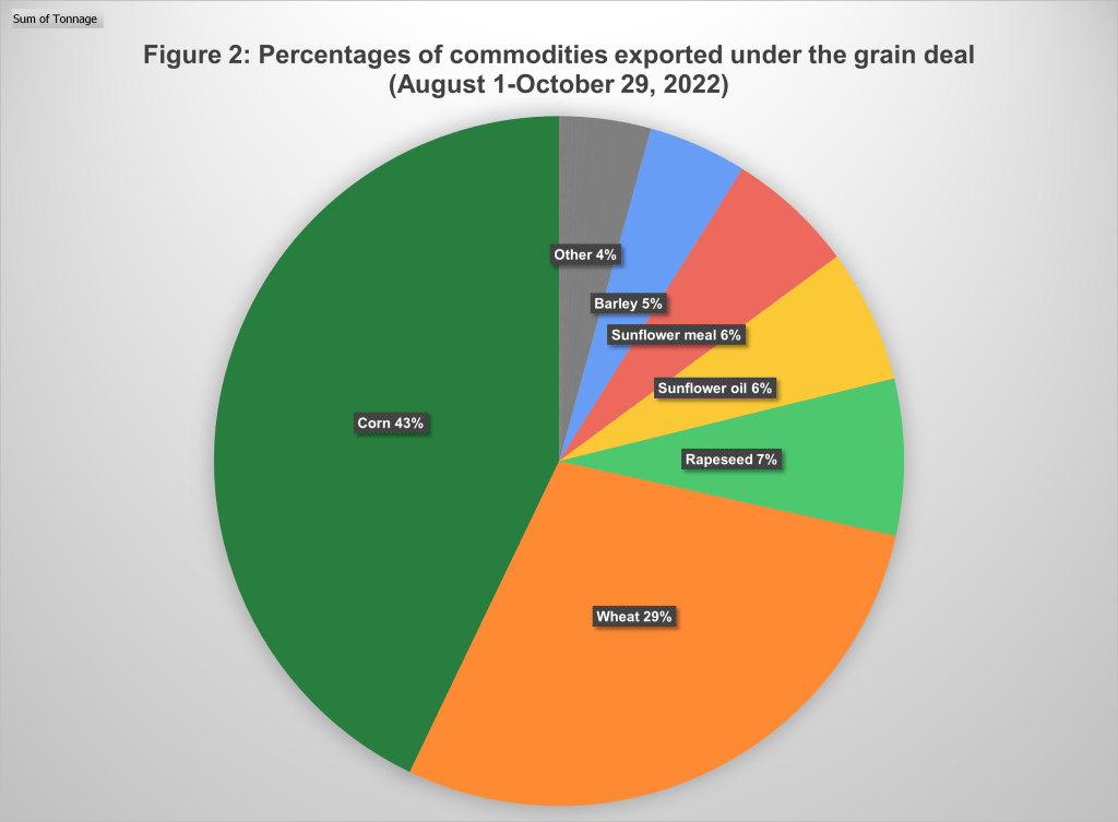 While the Black Sea Grain Initiative has been heralded for moving grain from a cradle of wheat production to the tables of those who are food insecure (UNCTAD, 2022: 3), corn has in fact been the main crop exported (see figure 2). Between August 1 and October 29, a total of 4,001,897 tons of corn left the ports in the Ukraine compared to 2,674,156,695 tons of wheat, approximately a ratio of 3:2. Spain has been the main destination of Ukraine’s corn exports under the Initiative, receiving 833,356 tons of corn, or 30% of the total, up to now. Corn imported by Spain is mainly used as animal feed and feedstock for bioethanol production, the latter a controversial use of a food crop.