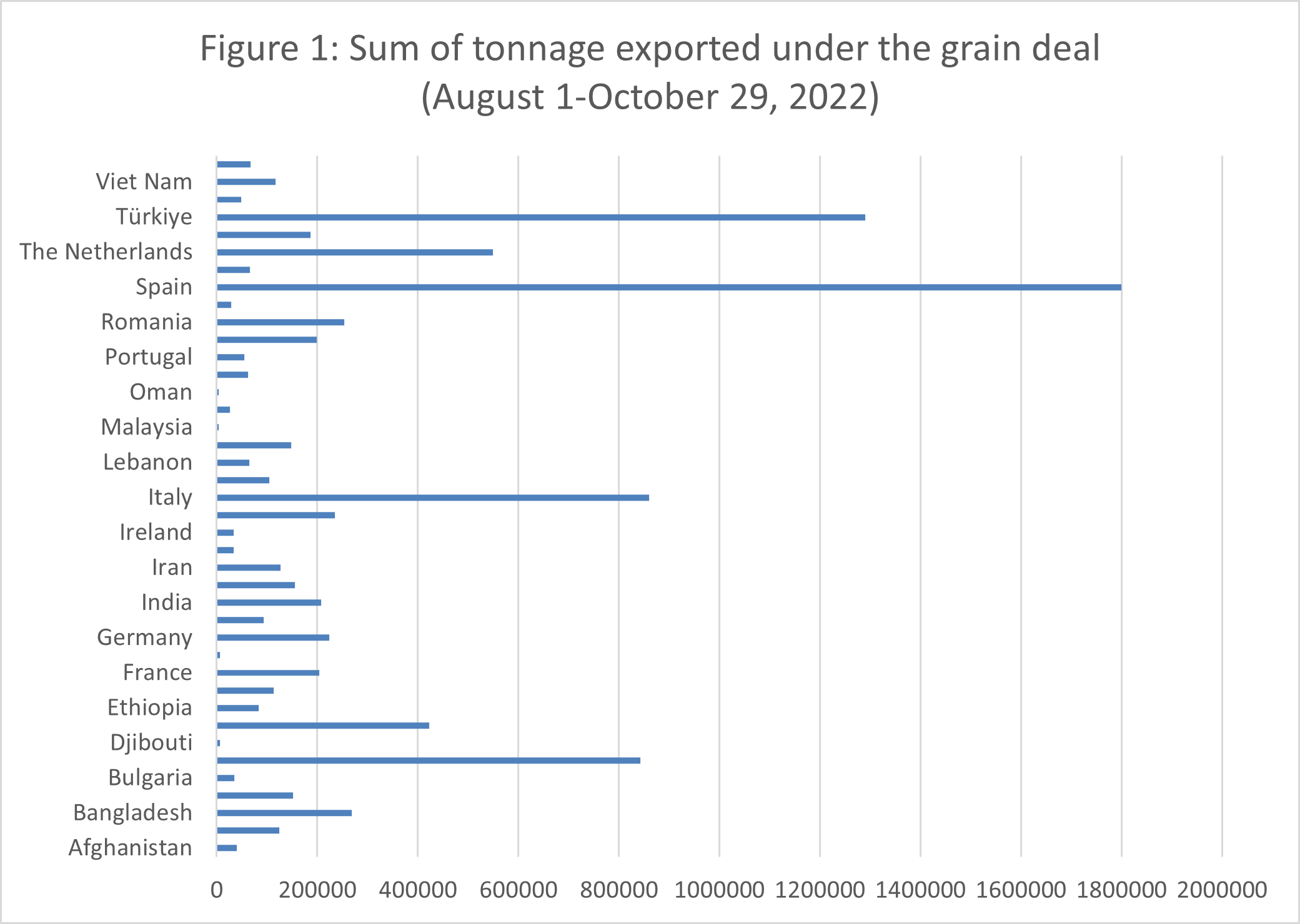 While the Black Sea Grain Initiative has been heralded for moving grain from a cradle of wheat production to the tables of those who are food insecure (UNCTAD, 2022: 3), corn has in fact been the main crop exported (see figure 2). Between August 1 and October 29, a total of 4,001,897 tons of corn left the ports in the Ukraine compared to 2,674,156,695 tons of wheat, approximately a ratio of 3:2. Spain has been the main destination of Ukraine’s corn exports under the Initiative, receiving 833,356 tons of corn, or 30% of the total, up to now. Corn imported by Spain is mainly used as animal feed and feedstock for bioethanol production, the latter a controversial use of a food crop.