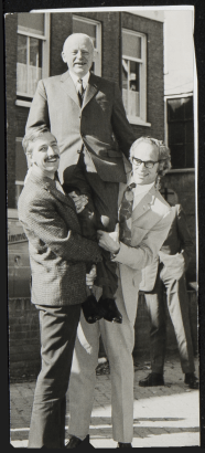 Photo: E.W. Hofstee on the shoulders of the sociologists Ad Nooij and Rien Munters at the occasion of the 25th anniversary