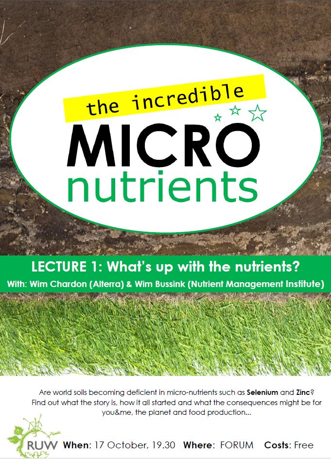 The kick off lecture of the RUW Series is October 17th: What’s up with the nutrients by Wim Bussink (Nutrient Management Institute) and Wim Chardon (Alterra), 19.30 in the Forum building, room C221.